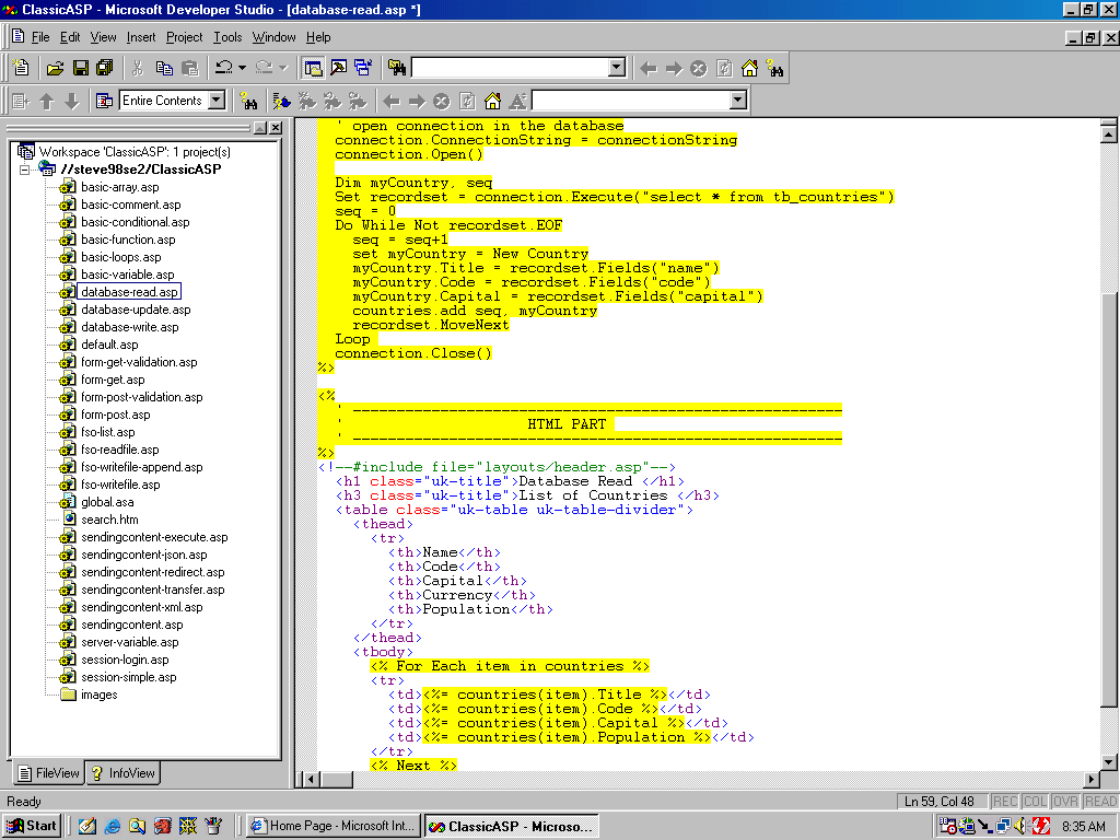 I was able to absorb most of what he showed me, typical code patterns for that time would be server-side VBScript implementing an ADO connection to connect to a SQL Server DB, retrieve the related data and render it into an HTML Table.
